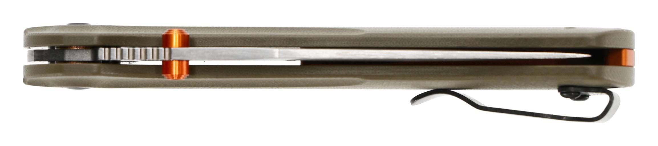 Dyskretne przenoszenie noża w kieszeni umożliwia klips Deep Carry z możliwością mocowania po dwóch stronach okładzin. W rękojeści znajduje się również otwór umożliwiający mocowanie linki lub oplotu z paracordu. Wyrazista pomarańczowa kolorystyka okładzin sprawia, że nóż jest lepiej zauważalny na tle leśnego runa i łatwiej go odszukać w razie zgubienia.