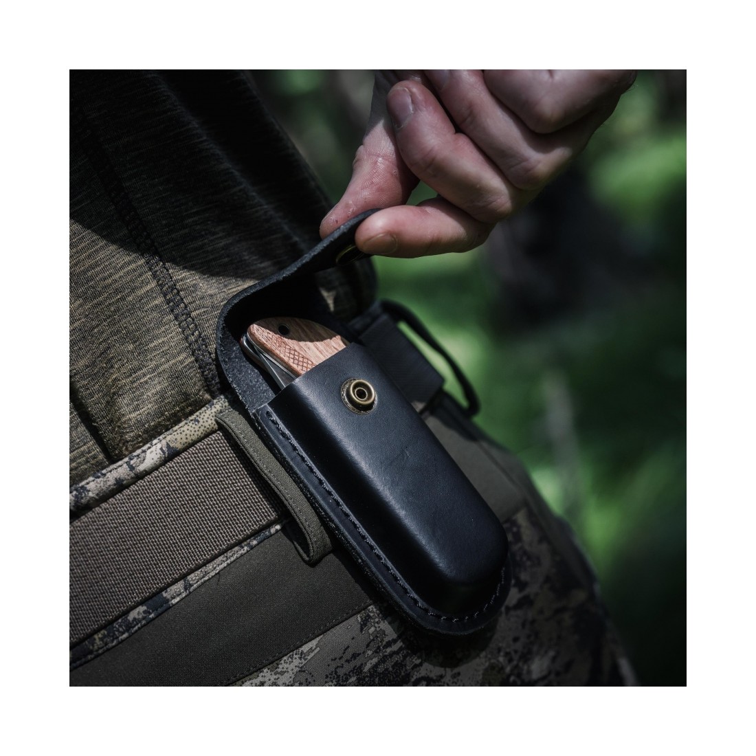 Okładziny chwytu noża są wykonane z drewna i posiadają ryflowania antypoślizowe. Tył został zaokrąglony dla lepszego ułożenia noża w dłoni. Na przodzie rękojeści ulokowano podcięcie na palec wskazujący. W połączeniu z rowkowaniem na ostrzu ułatwia ono stabilne operowanie nożem. Wraz z nożem otrzymasz wytrzymały cordurowy pokrowiec. Można go zamocować do pasa o szerokości do 50 mm.