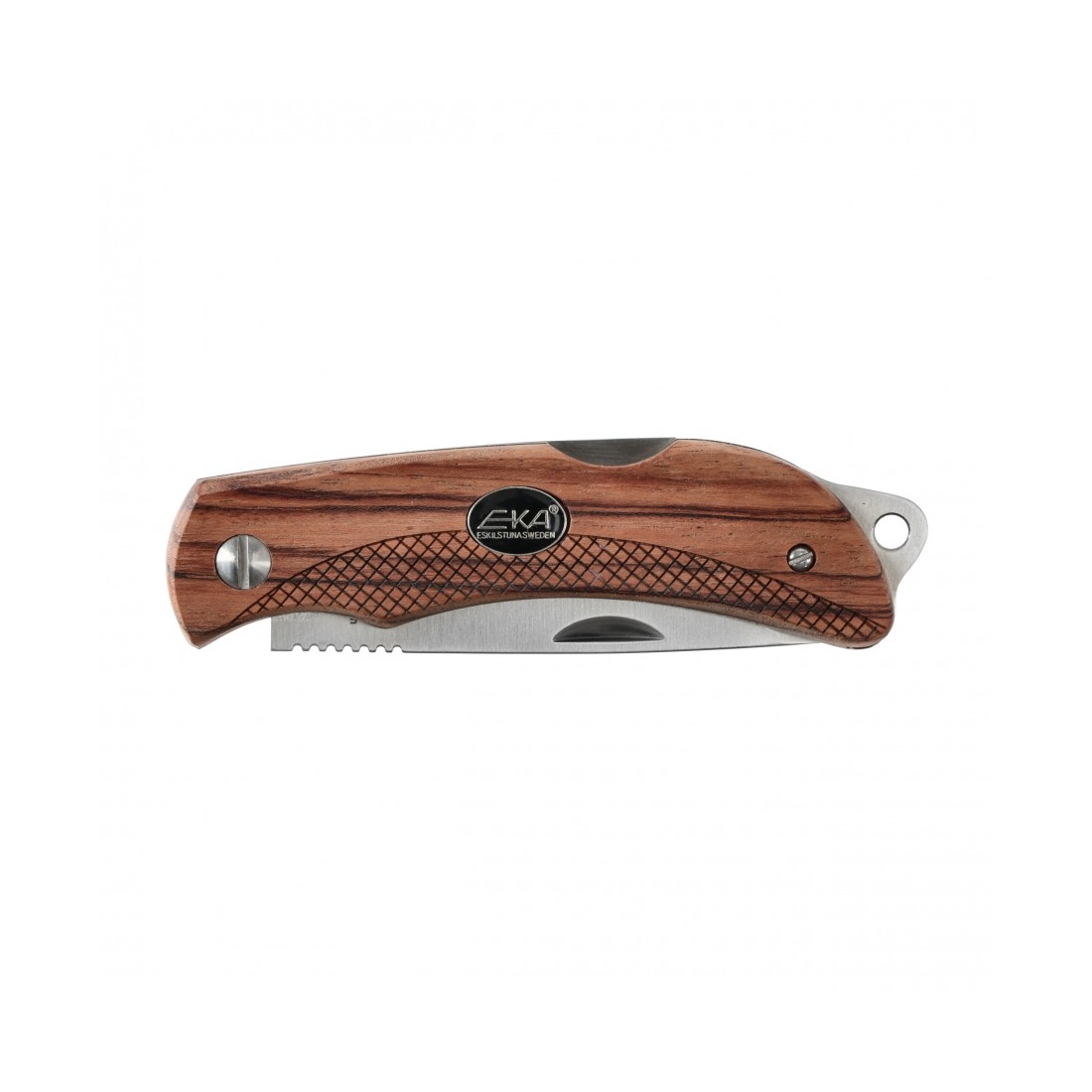 Nóż składany EKA Swede 8 Wood to popularna konstrukcja wywodzącą się ze Szwecji, którą charakteryzuje znakomita jakość wykonania oraz wysokie walory użytkowe. Ostrze wraz z wewnętrznym szkieletem zostało wykonane ze stali nierdzewnej Sandvik 12C27 o twardości 57-59 HRC. co czyni go idealnym narzędziem np. dla myśliwych i kolekcjonerów. Na górnej powierzchni ostrza naniesiono ząbkowanie, o które można zaprzeć kciuk i lepiej kontrolować cięcie. Dodatkowo nożyk charakteryzuje bardzo dobre wyważenie, ergonomia oraz solidne spasowanie ze sobą poszczególnych elementów. Cechą szczególną prezentowanego modelu jest elegancka rękojeść wykonana z drewna, na którą naniesiono ryflowania przeciwpoślizgowe.