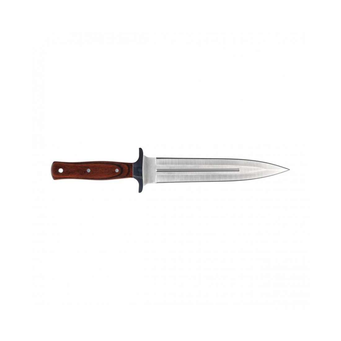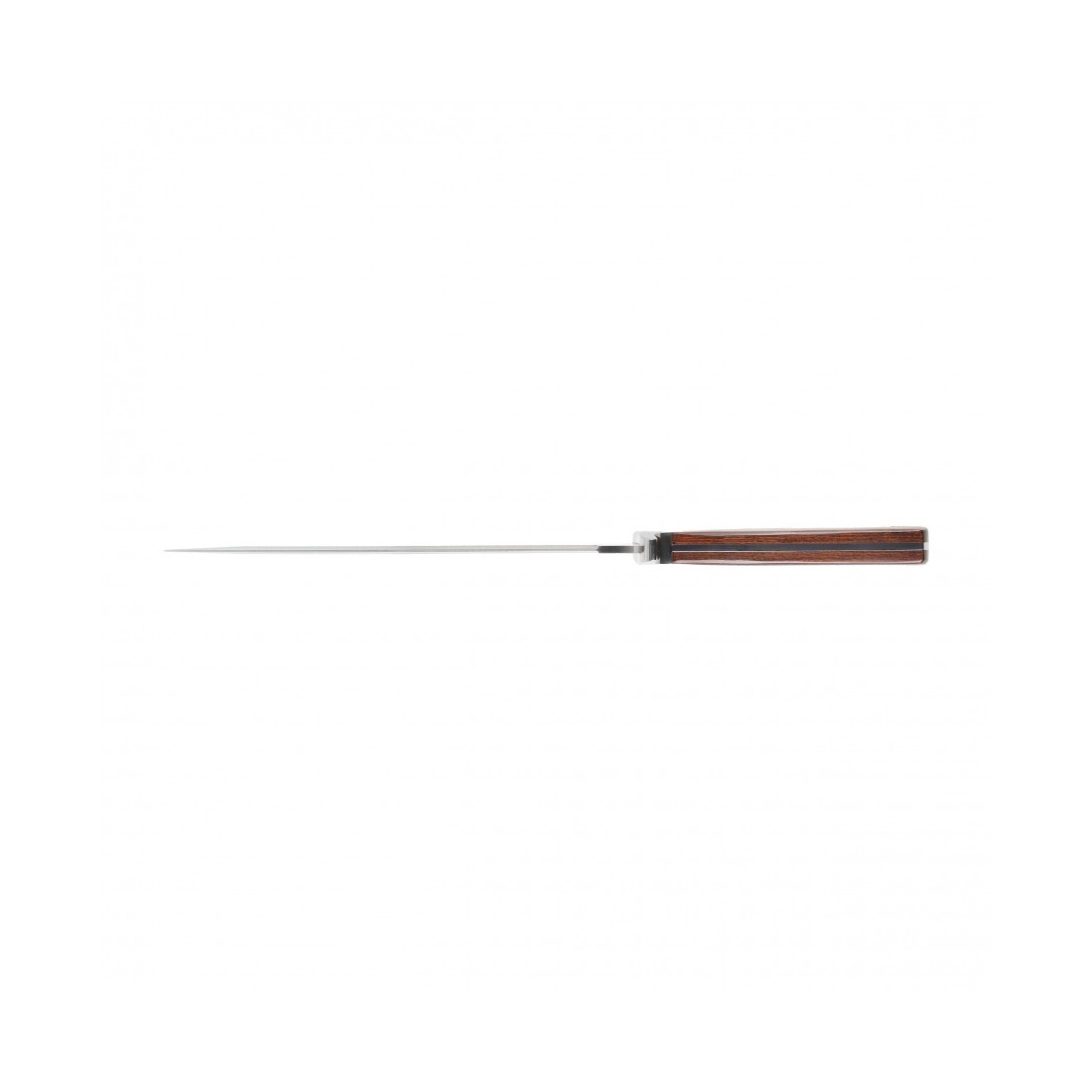 Rękojeść wykonano z trwałego laminatu Pakkawood, który łączy naturalne drewno z żywicami fenolowymi. Materiał ten zapewnia odporność na wilgoć, zmiany temperatury i uszkodzenia mechaniczne, jednocześnie oferując pewny i komfortowy chwyt. Charakterystyczne brązowo-czarne usłojenie świetnie komponuje się z polerowaną stalą klingi. W tylnej części rękojeści znajduje się otwór na rzemień lub paracord.