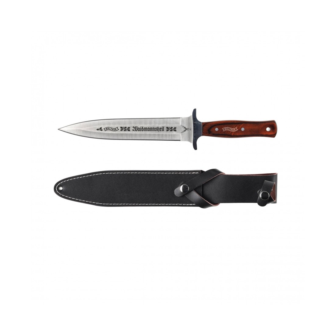 Sztyletowa głownia o długości 235 mm została wykonana ze sprawdzonej stali nierdzewnej 440C, cenionej za wysoką odporność na korozję, dobrą twardość oraz długie utrzymywanie ostrości roboczej. Obustronny szlif oraz zbrocze na krew zwiększają funkcjonalność ostrza i podkreślają jego myśliwski charakter. Klingę zdobi grawer z logotypem Walther oraz tradycyjnym pozdrowieniem myśliwskim „Waidmannsheil” (Darz Bór!).