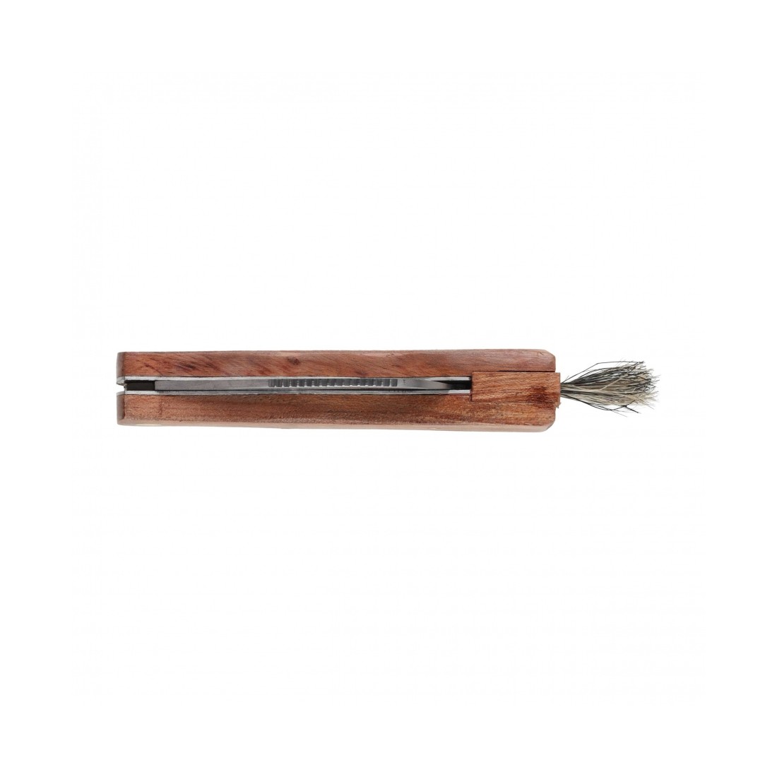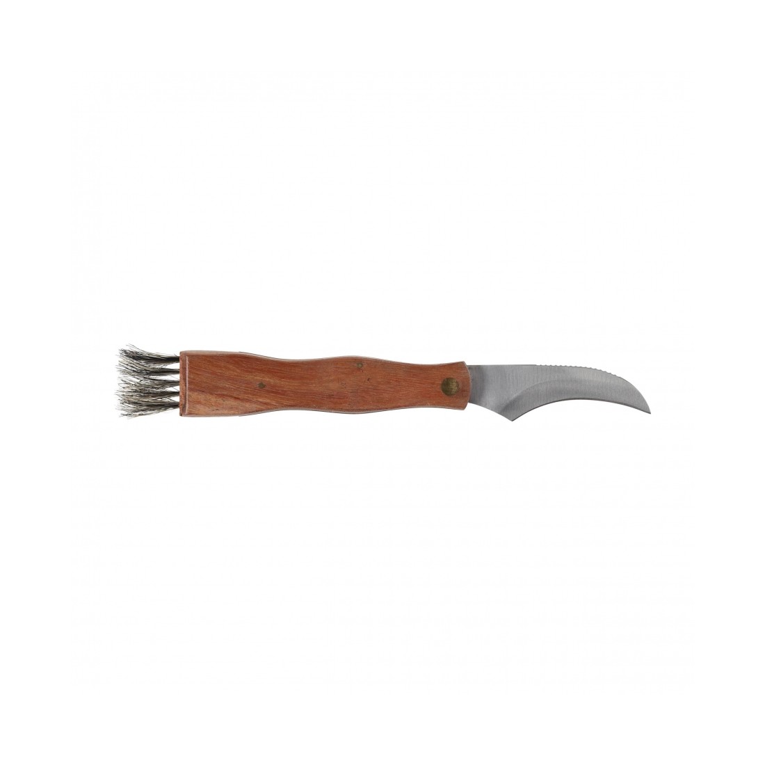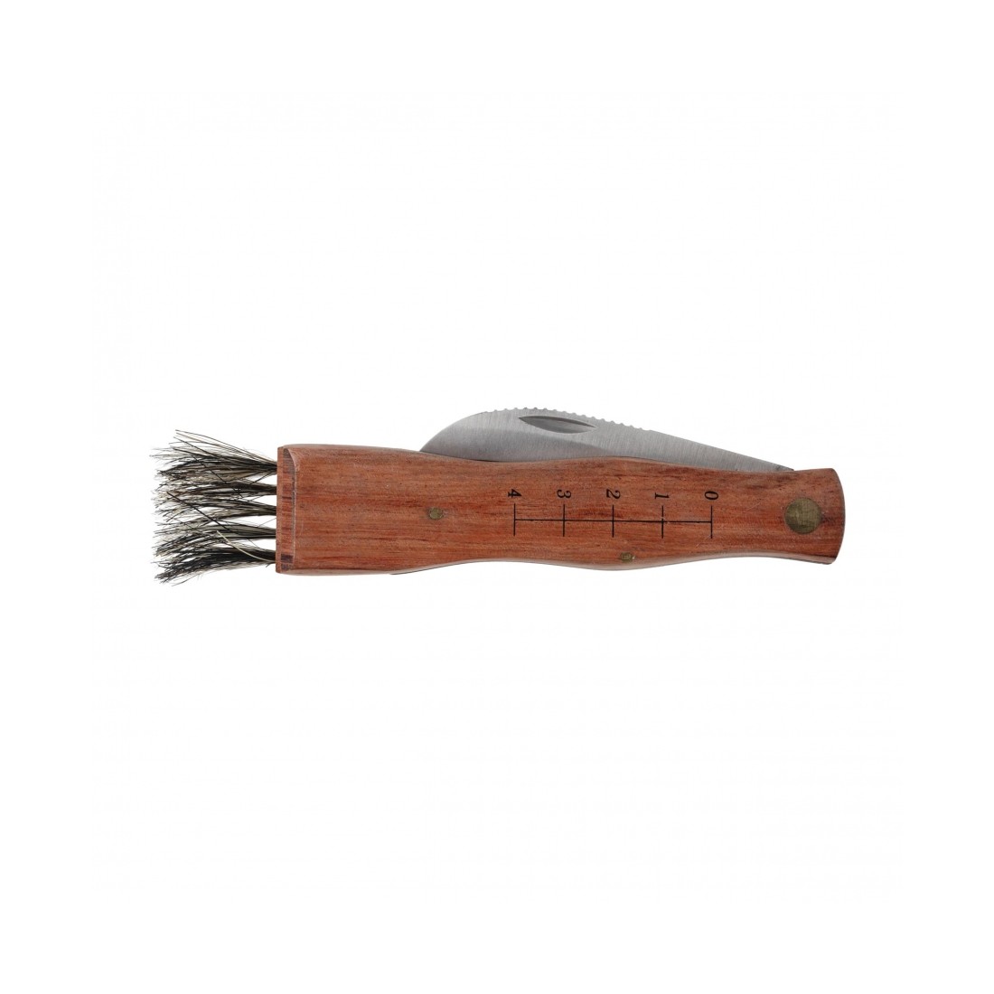 Na grzbiecie ostrza znajdziesz ząbkowanie, które poprawia chwyt i kontrolę podczas cięcia, szczególnie w mokrych lub śliskich warunkach. To detale, które robią różnicę podczas intensywnej pracy w lesie. Ale najważniejsze – nóż ma wbudowany pędzelek do czyszczenia grzybów. To narzędzie, którego nie może zabraknąć w rękach prawdziwego grzybiarza. Delikatna szczoteczka pozwala oczyścić kapelusz i trzon bez ryzyka uszkodzenia delikatnych struktur.