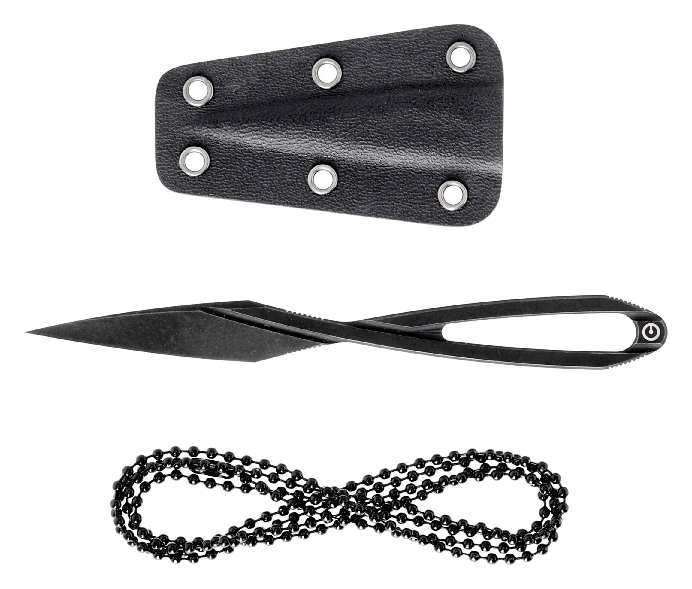 W zestawie znajduje się wytrzymała pochewka z kydexu, która zapewnia bezpieczne przenoszenie noża. Dzięki dołączonemu łańcuszkowi model można wygodnie nosić na szyi, a dodatkowe otwory montażowe umożliwiają przypięcie go do plecaka, pasa lub oporządzenia.