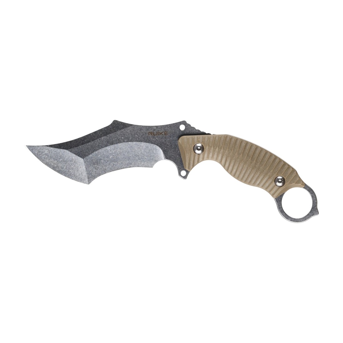 Ruike P181-B to nóż taktyczny typu karambit, wyposażony w stałą głownię ze stali nierdzewnej 14C28N, rękojeść z laminatu G10 w kolorze zielonym, charakterystyczny stalowy pierścień oraz polimerową pochewkę z klipsem 360°. P181-B1 to nóż do zastosowań taktycznych, ratowniczych oraz sytuacji gdzie potrzebujemy narzędzia z wytrzymałym czubkiem, oraz agresywną krawędzią tnącą.