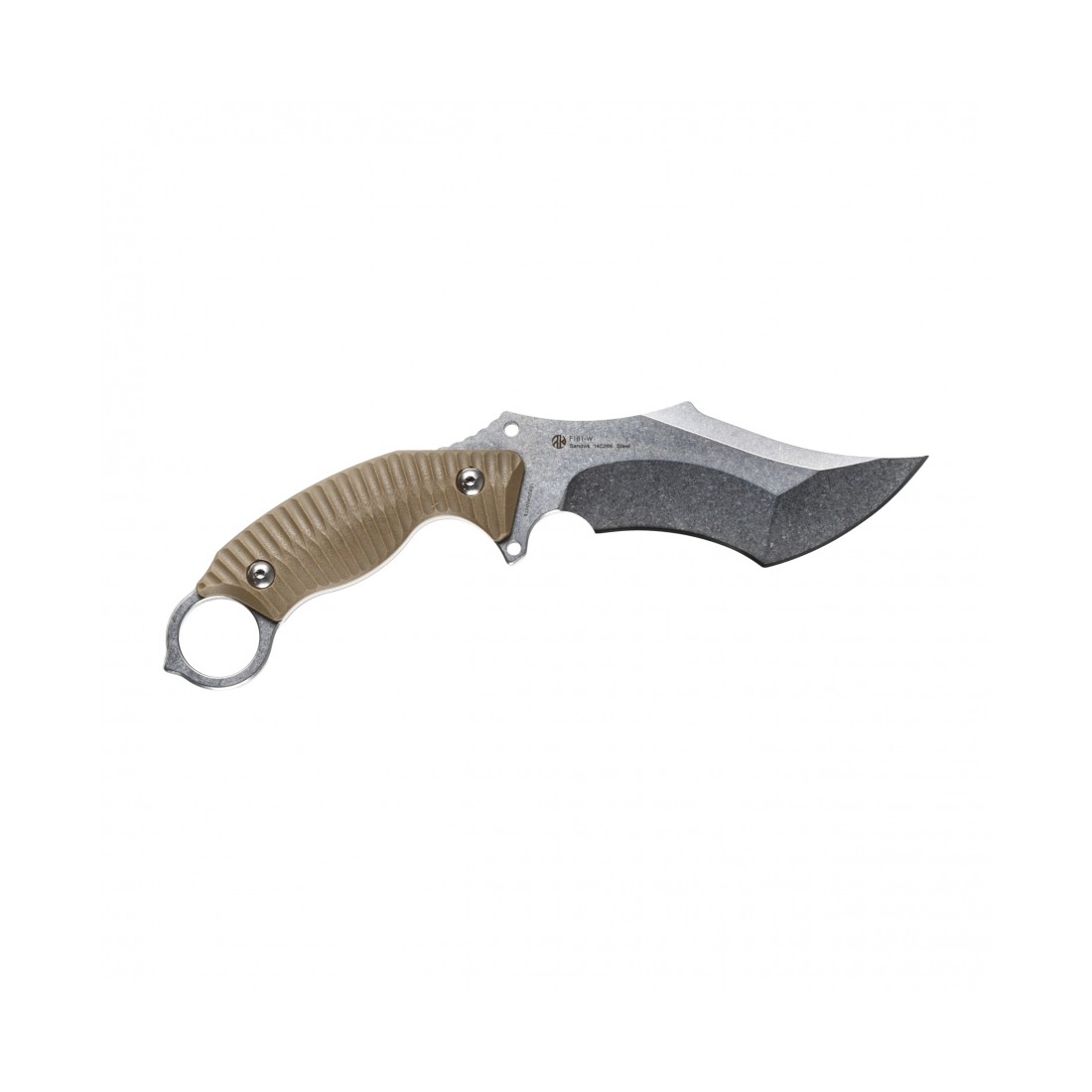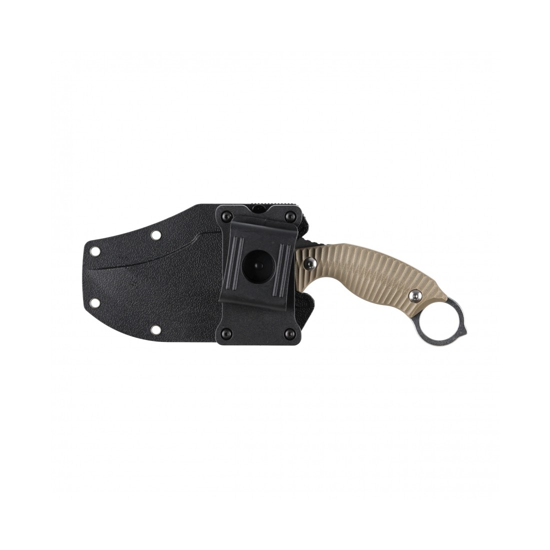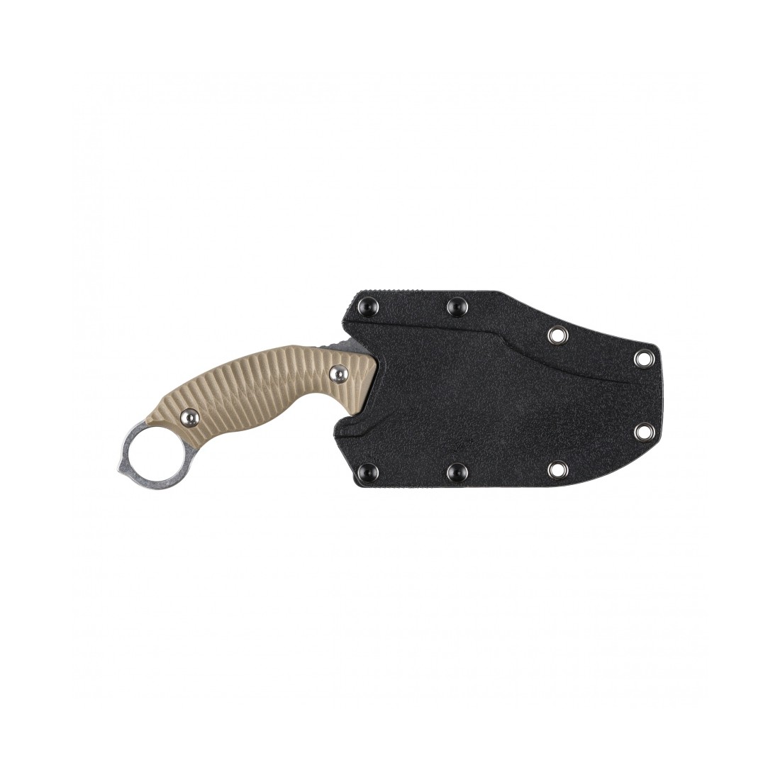 Za komfort operowania nożem odpowiada profilowana rękojeść, którą tworzą okładziny z frezowanego laminatu G-10. Charakterystyczne żebrowanie zapewnia wysoką przyczepność i stabilność chwytu. Rękojeść noża zakończona jest stalowym pierścieniem, umożliwiającym błyskawiczną zmianę chwytu, a także wykorzystywanie go w roli pobijaka lub awaryjnego zbijaka do szyb. Do przenoszenia noża przy pasie służy lekka i wytrzymała pochewka z polimeru, wyposażona w obrotowy klips umożliwiający jej ustawienie pod wygodnym dla nas kątem.