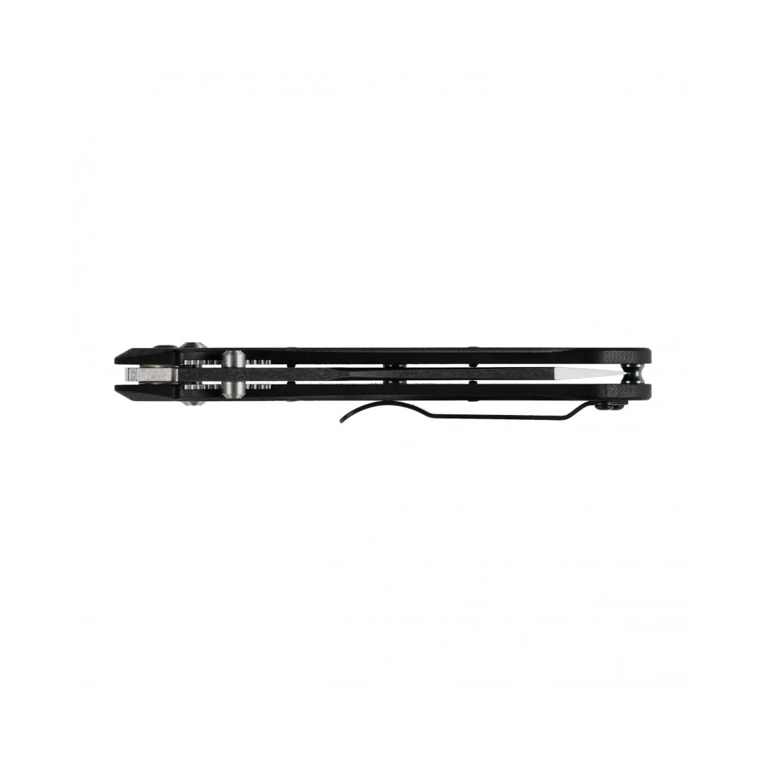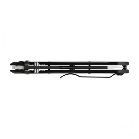 Ergonomiczna rękojeść wykonana z trwałego kompozytu G10 wzmocniona została linersami ze stali nierdzewnej. Miłą dla oka jest tytanowa przekładka która dodatkowo została poddana anodyzacji. Do noża dołączono przekładalny klips.