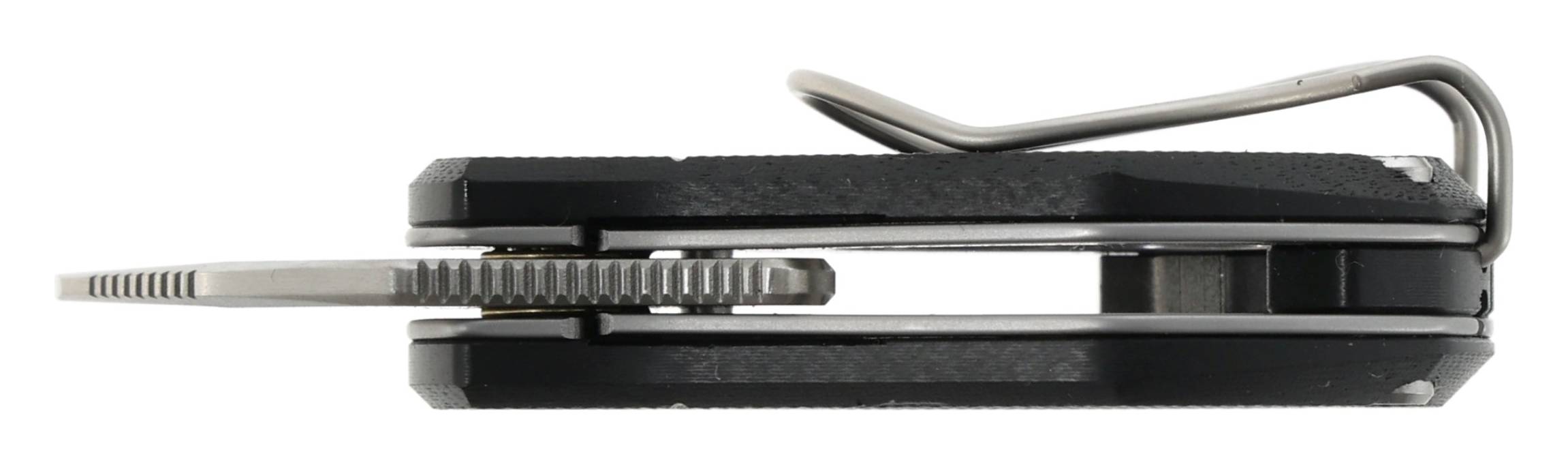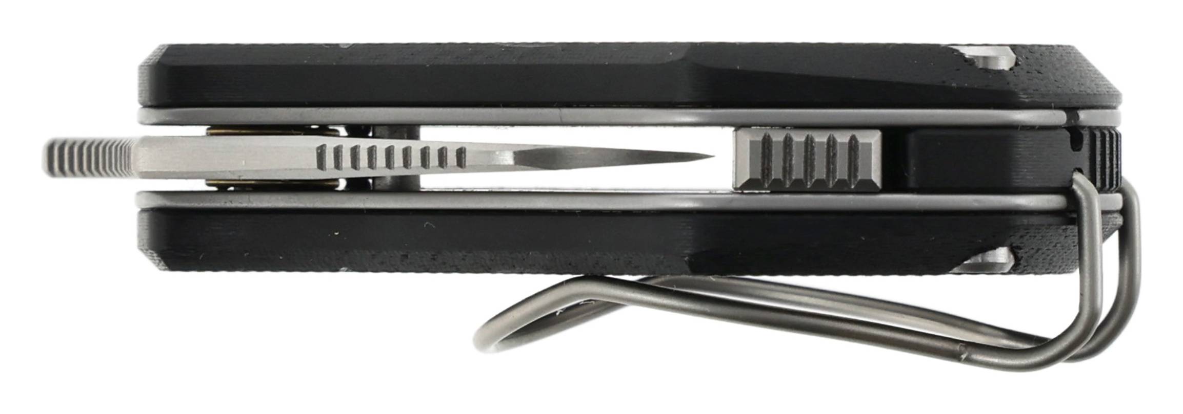 - Ergonomiczna rękojeść: Wykonana z wytrzymałego kompozytu G10, odpornego na działanie warunków atmosferycznych i uszkodzenia mechaniczne, zapewnia wygodny i pewny chwyt. Backspacer z G10 zwiększa sztywność konstrukcji, a dwupozycyjny klips pozwala na przenoszenie noża w pozycji Tip Up zarówno po prawej, jak i lewej stronie.