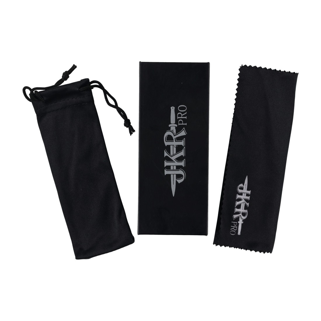 Rękojeść wykonana z wytrzymałego laminatu G10 zapewnia pewny chwyt nawet w trudnych warunkach. Nóż wyposażono w stalowy klips do wygodnego noszenia oraz otwór na linkę. W zestawie znajduje się także etui materiałowe, chusteczka do czyszczenia i eleganckie pudełko – idealne również na prezent.