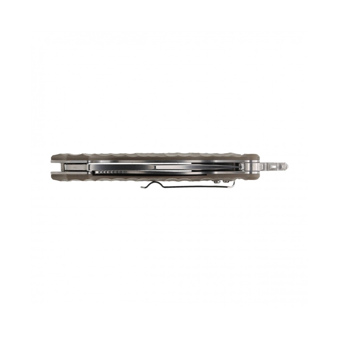 Rękojeść z frezowanego laminatu G-10 zapewnia pewny i antypoślizgowy chwyt, a stalowe wkładki (420) wzmacniają konstrukcję. Na końcu rękojeści umieszczono stalowy pierścień karambitowy, umożliwiający natychmiastową zmianę chwytu, operacje taktyczne lub użycie jako narzędzia uderzeniowego. Solidny klips pozwala na wygodne i dyskretne noszenie noża na pasie, kamizelce taktycznej lub w kieszeni.