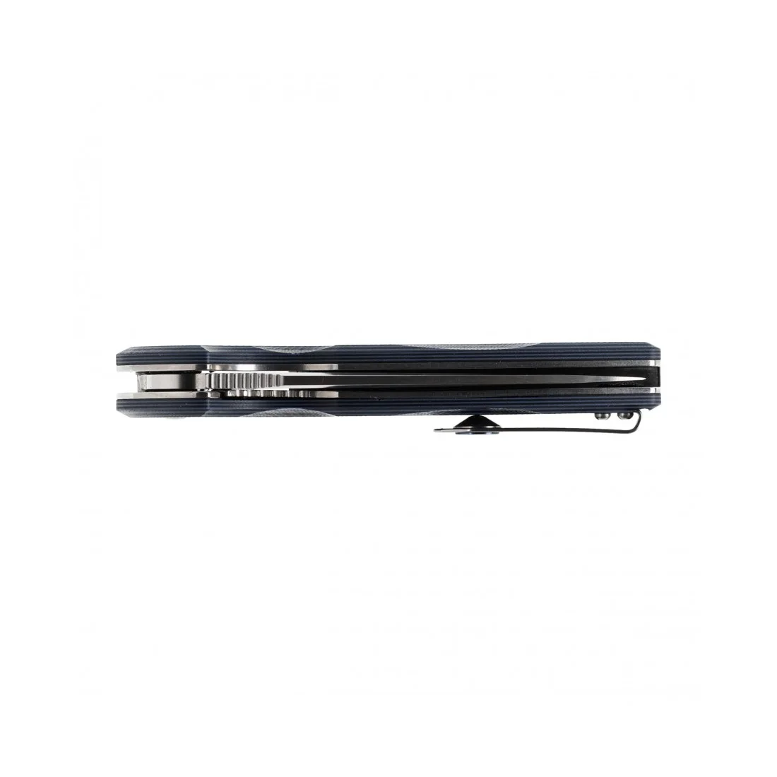Teksturowana rękojeść wykonana z wytrzymałego kompozytu G10 zapewnia pewny chwyt nawet w trudnych warunkach, również mokrą lub zabrudzoną dłonią. Model został wyposażony w czarno-niebieskie okładziny, które przyciągają wzrok innych użytkowników.