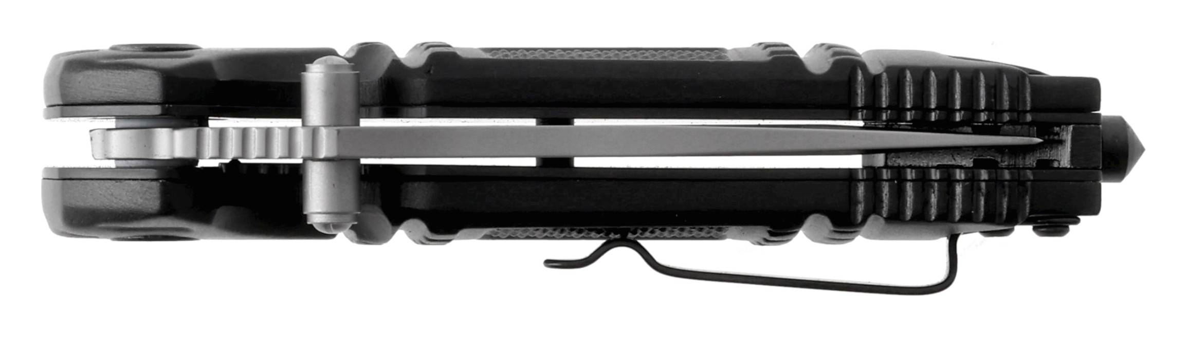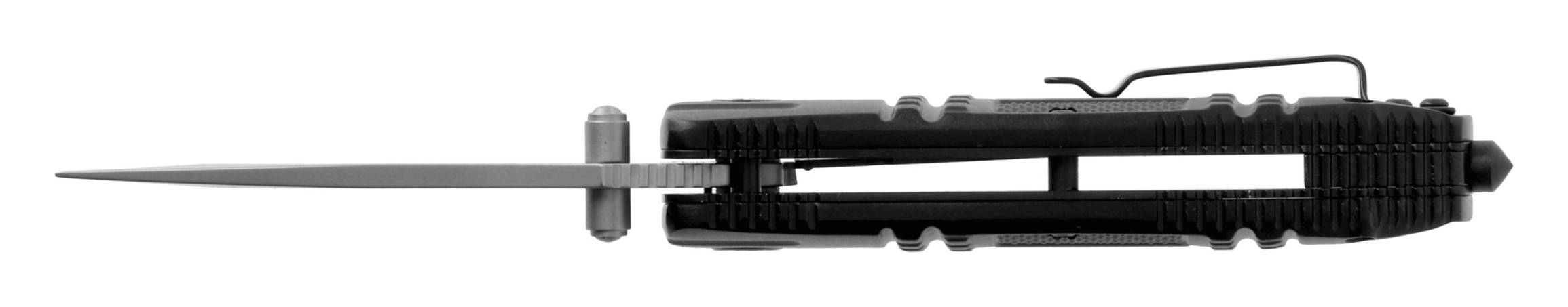 Profilowana rękojeść z anodowanego aluminium została dodatkowo wzmocniona stalowymi wkładkami, co zwiększa trwałość konstrukcji. Agresywne teksturowanie zapewnia pewny chwyt nawet w trudnych warunkach. W tylnej części rękojeści umieszczono praktyczny zbijak szyb, który sprawdzi się w sytuacjach awaryjnych.