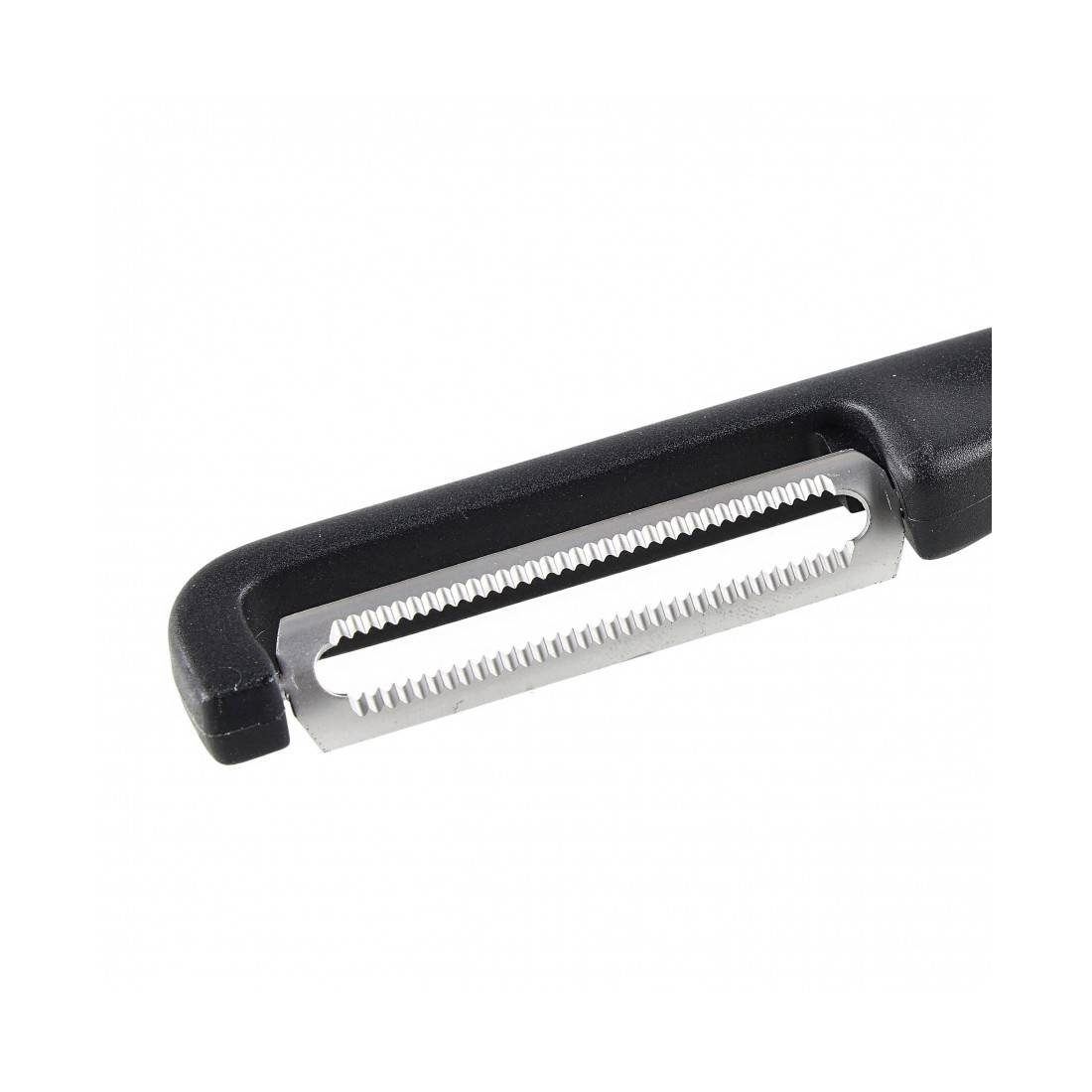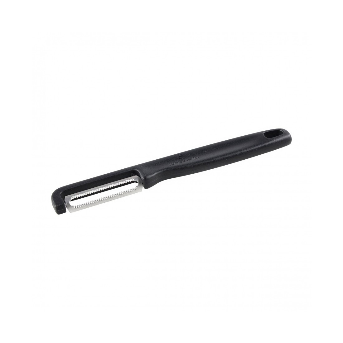 Obieraczka uniwersalna Victorinox to specjalnie narzędzie kuchenne służące do łatwego obierania warzyw i owoców z miękkich i twardych skórek. Zaprojektowana została w ten sposób, tak pasowała do obu dłoni. Rękojeść o ergonomicznym profilu wykonana jest z solidnego tworzywa i ma otwór do zawieszenia. Ruchome ostrze jest ze stali nierdzewnej. Obieraczkę można myć pod bieżącą wodą oraz w zmywarce. Model jest w kolorze czarnym.