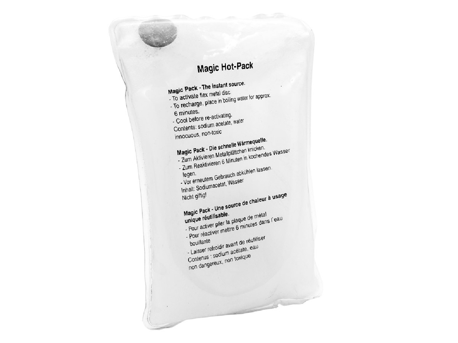 Aby uruchomić ogrzewacz wystarczy zgiąć blaszkę w środku, a płyn zamienia się w ciepłą masę grzejącą przez 1,5 godz. Płyn w środku opakowania jest nietoksyczny. Aby reaktywować ogrzewacz wystarczy na około 6 min umieścić opakowanie we wrzątku, a następnie ostudzić.