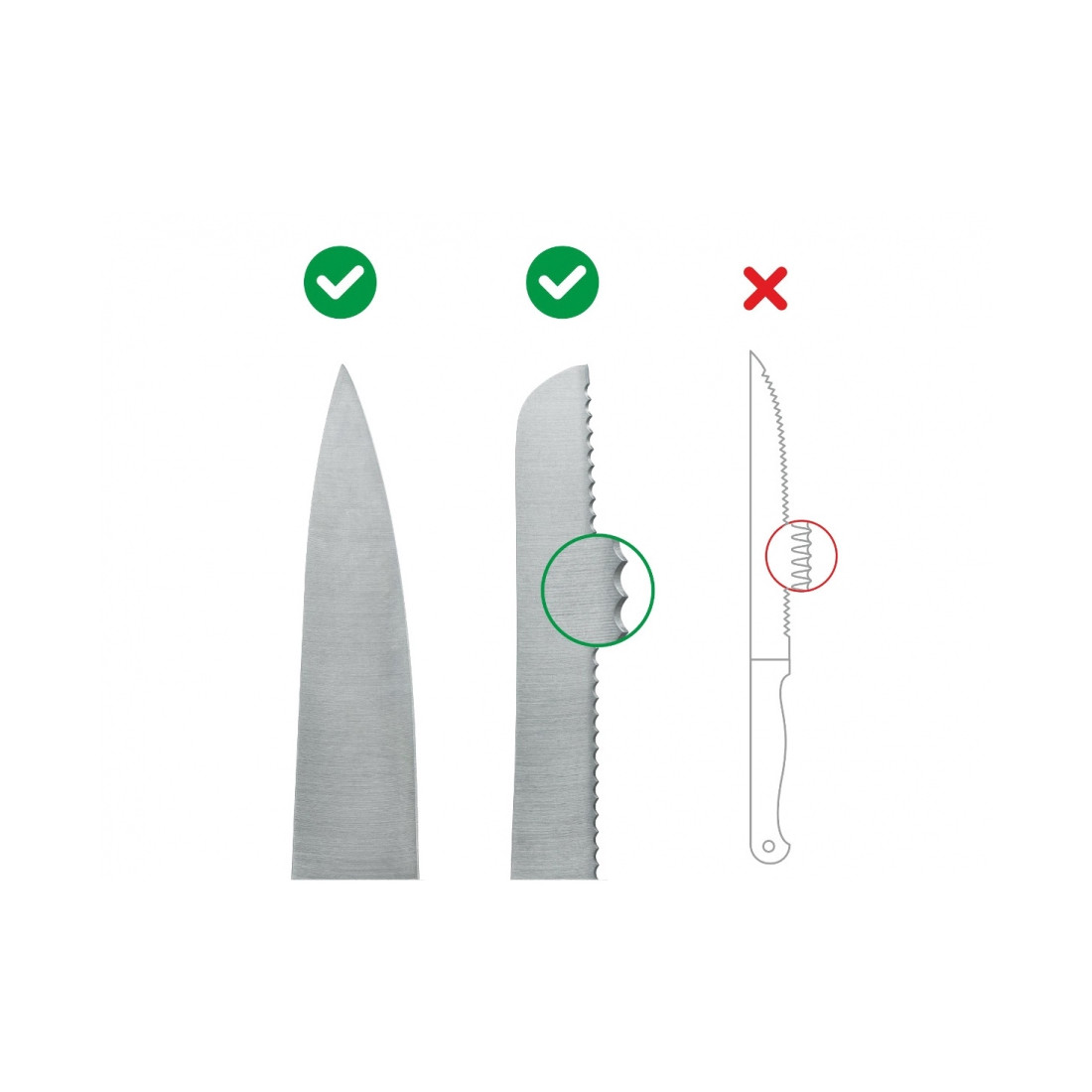 Za pośrednictwem jednej ostrzałki można naostrzyć zarówno noże z ostrzem gładkim, jak i ząbkowanym* (wyłączając noże z drobnymi ząbkami do steków).