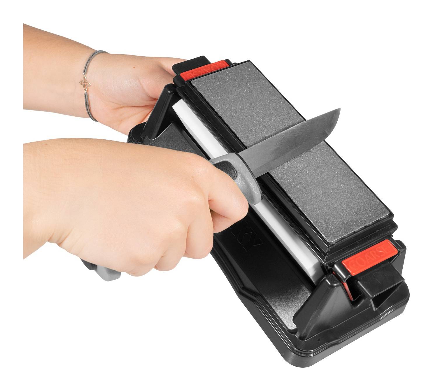 Polimerowa podstawa z gumowym, antypoślizgowym spodem zapewnia stabilność podczas ostrzenia. Wyjmowany moduł z kamieniami zwiększa komfort użytkowania oraz ułatwia obracanie pomiędzy poszczególnymi gradacjami.