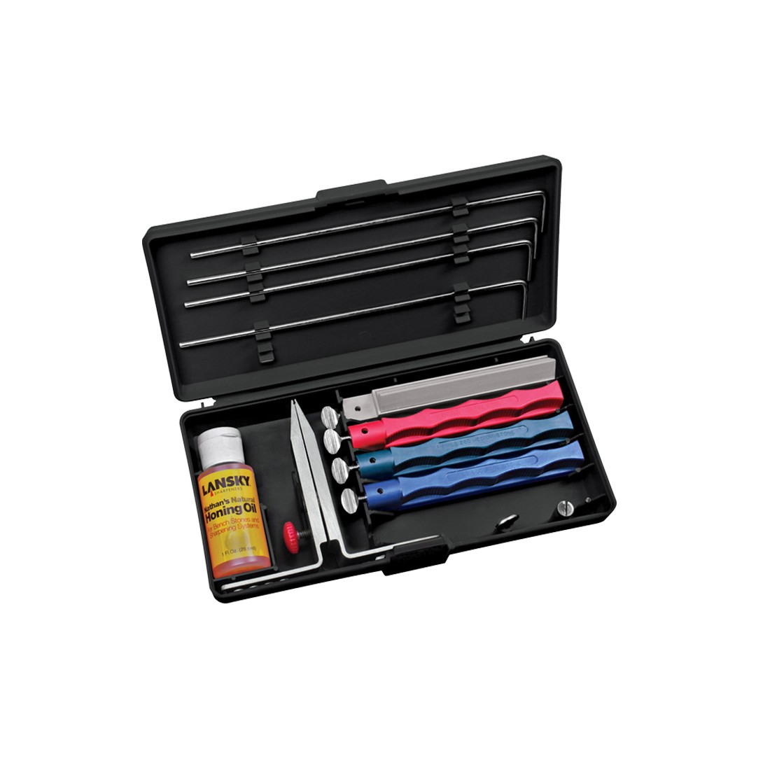 W zestawie znajduje się także olejek Lansky Nathans Honing, który zwiększa jakość i efekt ostrzenia. Kamienie pokryte podczas ostrzenia kilkoma kroplami oleju zachowują odpowiednią wilgotność, co wydłuża ich żywotność oraz ułatwia uzyskanie profesjonalnej ostrości.