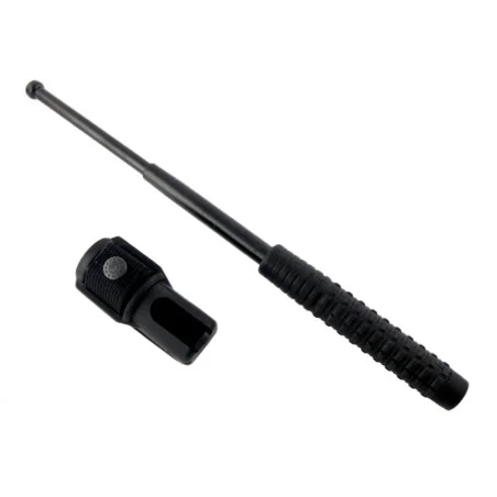 Pałka teleskopowa baton o długości 16 cali wykonana z hartowanej stali oksydowanej na czarno. To jedno z najbardziej skutecznych narzędzi w obronie koniecznej i awaryjnych sytuacjach. Ten najmniejszy model, doskonale nadaje się do dyskretnego przenoszenia. Skonstruowana z trzech stalowych prętów zahartowanych do twardości 40-50 HRC. Powłoka z oksydy o dużej odporności na ścieranie. Rękojeść z elastycznego tworzywa o antypoślizgowej fakturze uniemożliwia odebranie pałki przez napastnika. Kabura z otworem na pas umożliwia przenoszenie w stanie złożonym, lub rozłożonym.