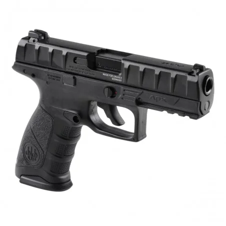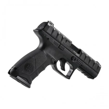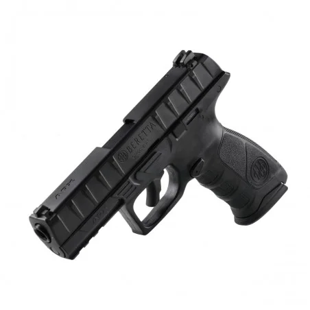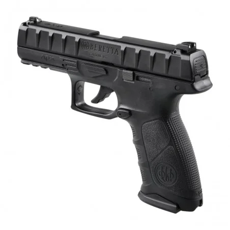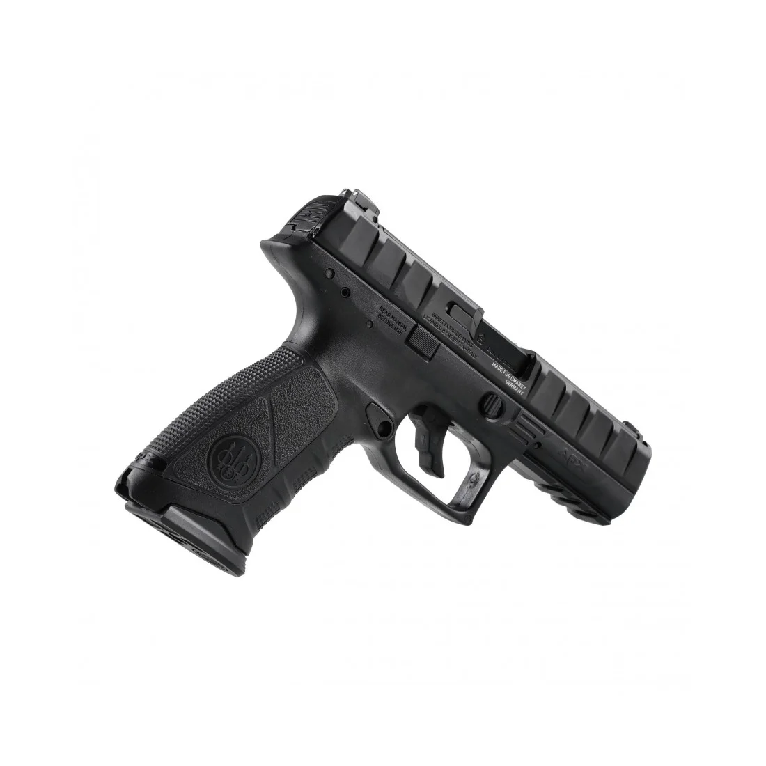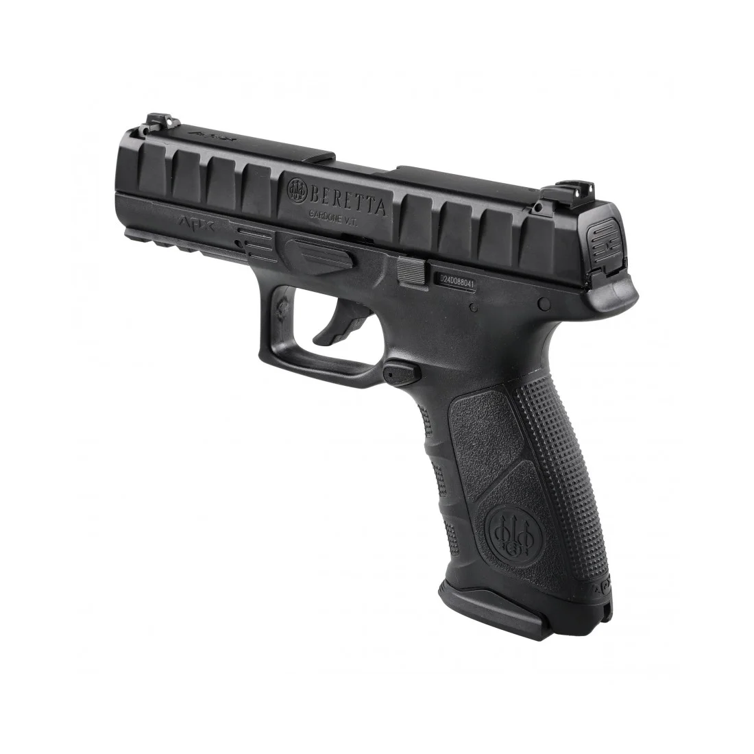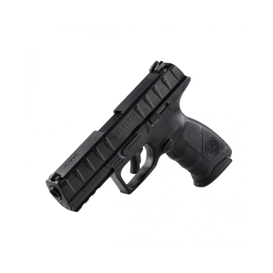 Beretta APX black 4,5 mm BB CO2 to nowoczesny pistolet wiatrówkowy z mocnym systemem blow-back, wyposażony w metalowy zamek, szynę akcesoryjną oraz pojemny magazynek. Wiatrówką ma nowoczesną konstrukcję, którą podkreśla metalowo-polimerowa budowa oraz specyficzne żebrowanie całego zamka, zapewniające wygodny chwyt podczas przeładowania. W oryginale Beretta APX to półautomatyczny pistolet przeznaczony dla wojska, policji oraz rynku cywilnego. Na muszce i szczerbinie naniesiono białe kropki, ułatwiające szybkie zgrywanie przyrządów na celu. To proste rozwiązania jest bardzo przydatne w momencie, kiedy strzelamy przy słabszym lub szczątkowym świetle.