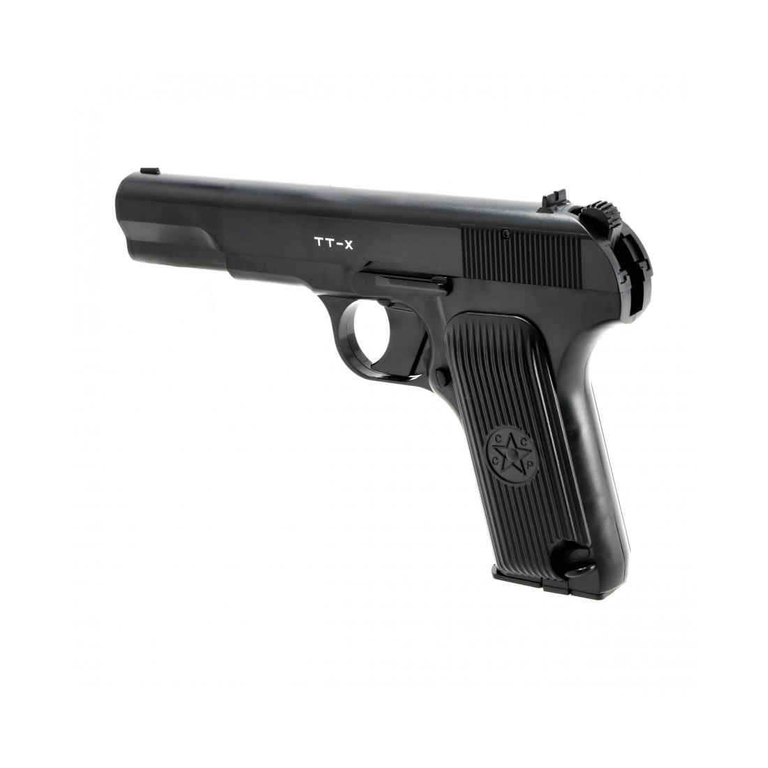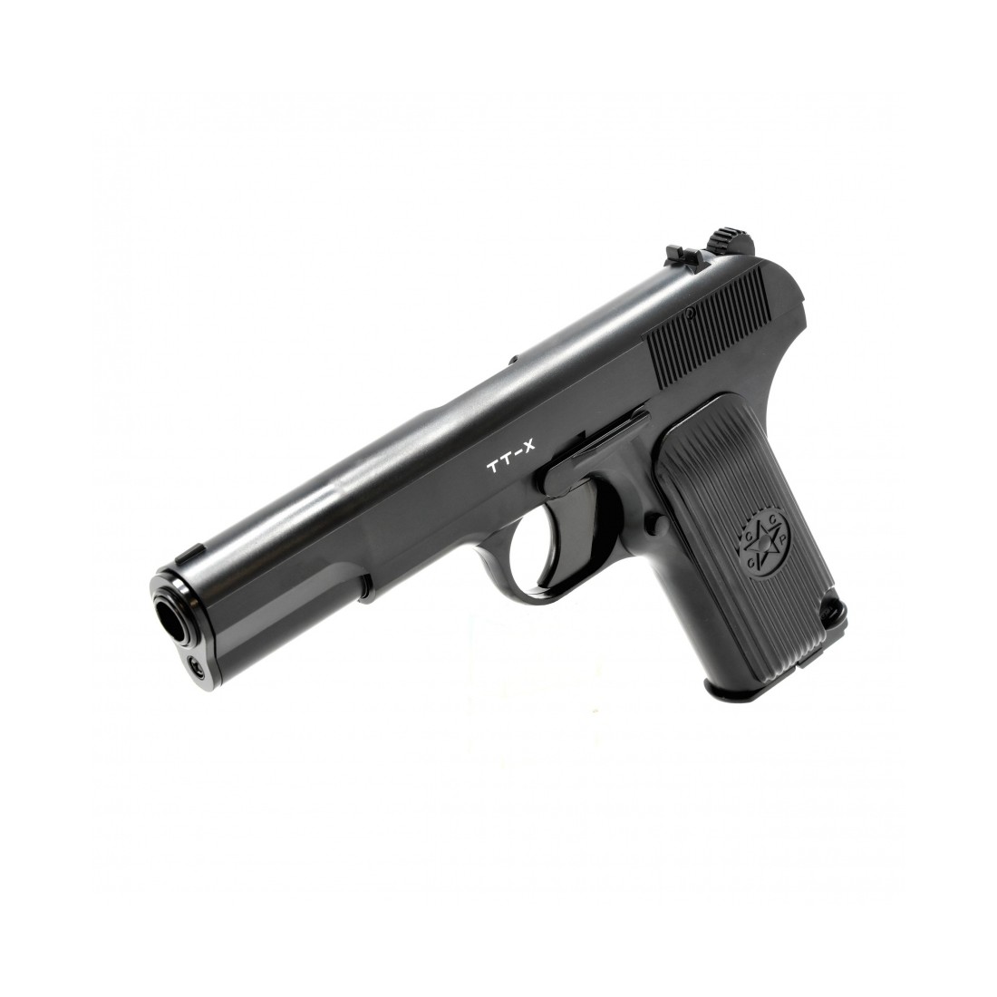 Borner TT-X 4,5 mm to rekreacyjna wiatrówka CO₂ inspirowana wyglądem słynnego pistoletu Tokariew, używanego przez żołnierzy podczas II wojny światowej. Model łączy klasyczny wygląd historycznej konstrukcji z nowoczesnym, wygodnym systemem zasilania CO₂, dzięki czemu świetnie sprawdzi się podczas rekreacyjnego strzelania do tarczy lub puszek.