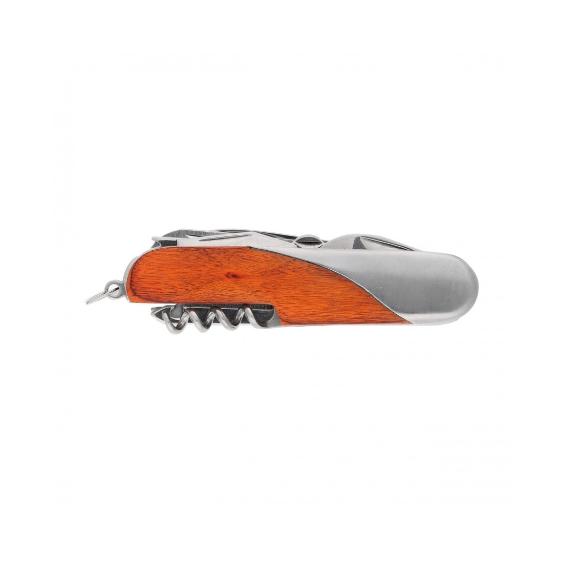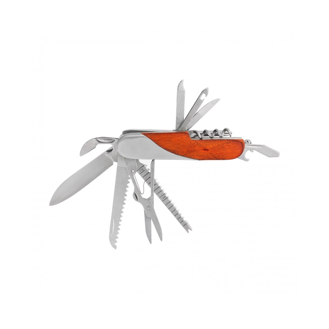 Fabrycznie nowy, wysokiej jakości scyzoryk wielofunkcyjny hiszpańskiej marki JOKER znanej na całym świecie ze swoich doskonałych wyrobów. Wykonany jest z mocnej stali nierdzewnej. Rękojeść wykonana jest z wytrzymałego drewna. Scyzoryk ten posiada szereg różnych narzędzi przydatnych przy majsterkowaniu jak i na biwaku. Przydatny również w turystyce, wędkarstwie, myślistwie itd. W komplecie pokrowiec z kordury z możliwością przypięcia do pasa. Całość zapakowana jest w ładne tekturowe pudełko co sprawia że nóż idealnie nadaje się na prezent.