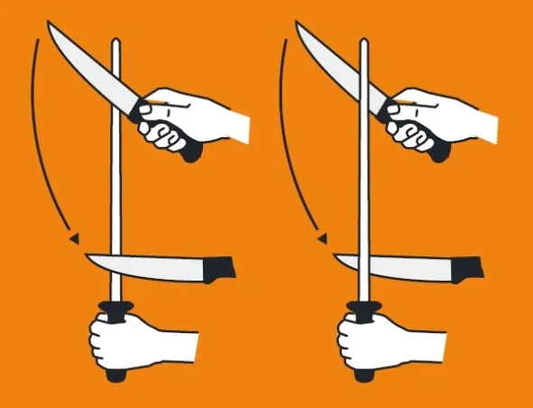 - Delikatnie ostrz nóż pod kątem około 20 stopni, przesuwając ostrze wzdłuż stali od nasady do czubka.