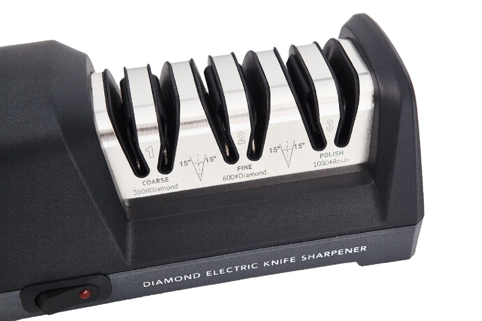 Wyposażona w trzystopniowy system ostrzenia z diamentowymi tarczami o gradacjach 360, 600 i 1000, zapewnia efektywne ostrzenie – od wstępnego szlifowania po finalne polerowanie ostrza.
