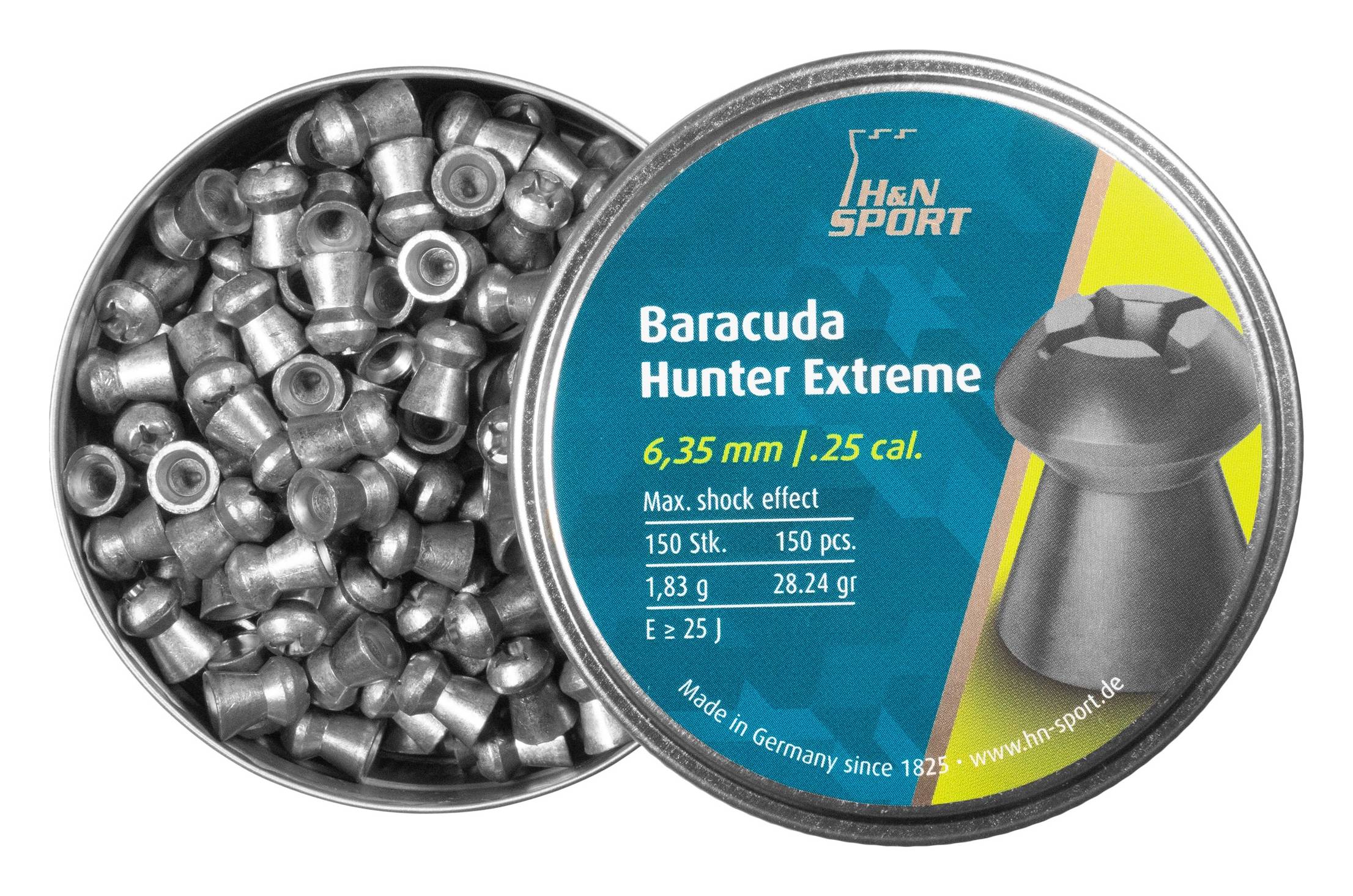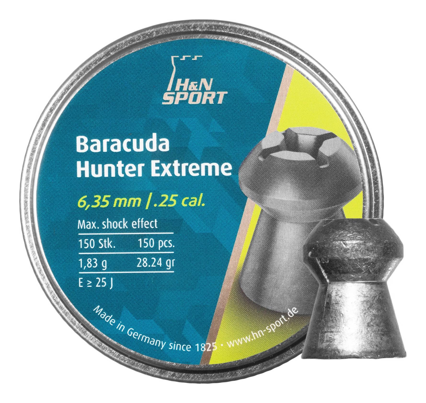 Diabolo H&N Baracuda Hunter Extreme 6,35/150 to ciężki, bardzo precyzyjny śrut do strzelań Field Target oraz długodystansowych. Dzięki krzyżowemu nacięciu na czubku, śrut posiada dużą energię obalającą oraz doskonałą aerodynamikę. Śrut zapewnia doskonałą powtarzalność oraz precyzję strzału, dlatego oprócz strzelania sportowego na zachodzie Europy jest również wykorzystywany do polowań na drobną zwierzynę.