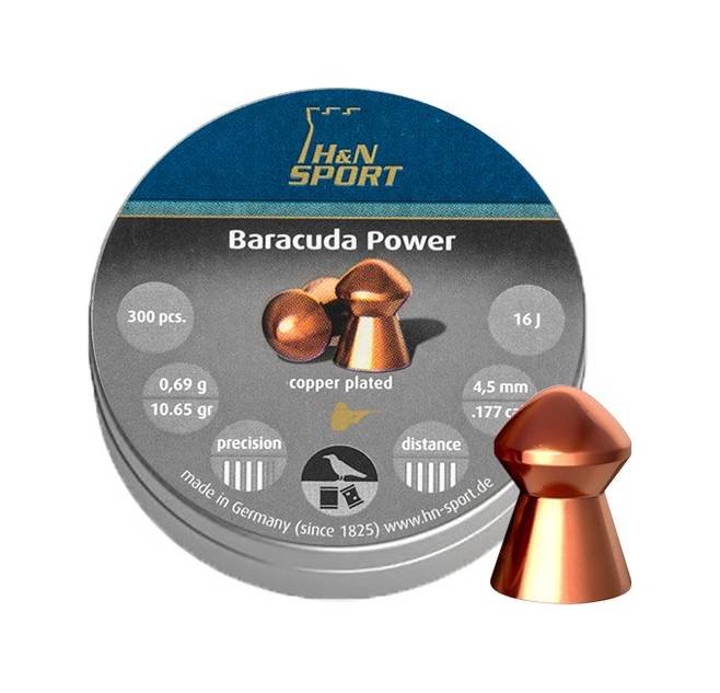 Baracuda Power to ciężki, precyzyjny śrut przeznaczony do strzelania na dalekie dystanse. Twarda miedziowa powłoka zwiększa przebijaność nawet o 20% w porównaniu do całkowicie ołowianych śrutów. Polecany do mocnych wiatrówek.