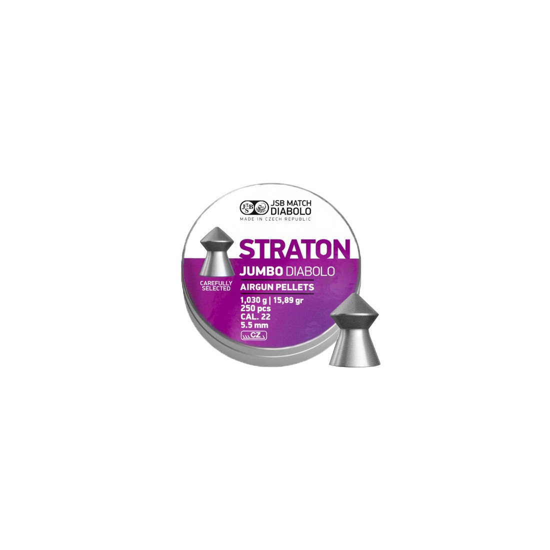 Jumbo Straton podobnie jak wszystkie śruty marki JSB, cechują się doskonałą jakością, która wpływa na celność i powtarzalność strzałów. JSB Jumbo Straton to popularny śrut pointed (szpic) z gładkim kielichem i stożkową główką. Śrut typu szpic cechuje się wysoką celnością, stabilną trajektorią lotu i dużą przebijalnością, dlatego jest powszechnie stosowany do niszczenia celów (butelki, puszki, itp.), polowań na szkodniki (w krajach gdzie jest to dozwolone) oraz strzelania długodystansowego. JSB Jumbo Straton o masie 15,89 gr zalecany jest do wiatrówek sprężynowych i PCP o prędkości początkowej do 250 m/s.