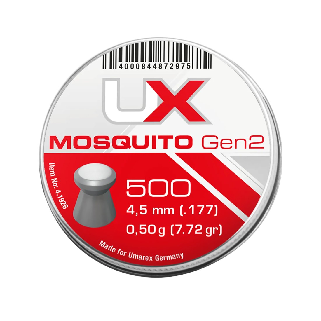 Śrut płaski UX Mosquito Gen.2 to amunicja do wiatrówek w kalibrze 4,5 mm Diabolo (.177). Śrut ten, ze względu na swój kształt, jest przeznaczony do strzelania tarczowego i rekreacyjnego. Śrut UX Mosquito ma spłaszczone czoło, dzięki czemu lepiej oddaje energię po trafieniu w cel i zostawia wyraźne, okrągłe przestrzeliny na tarczy. Metalowe opakowanie zawiera 500 sztuk śrucin.