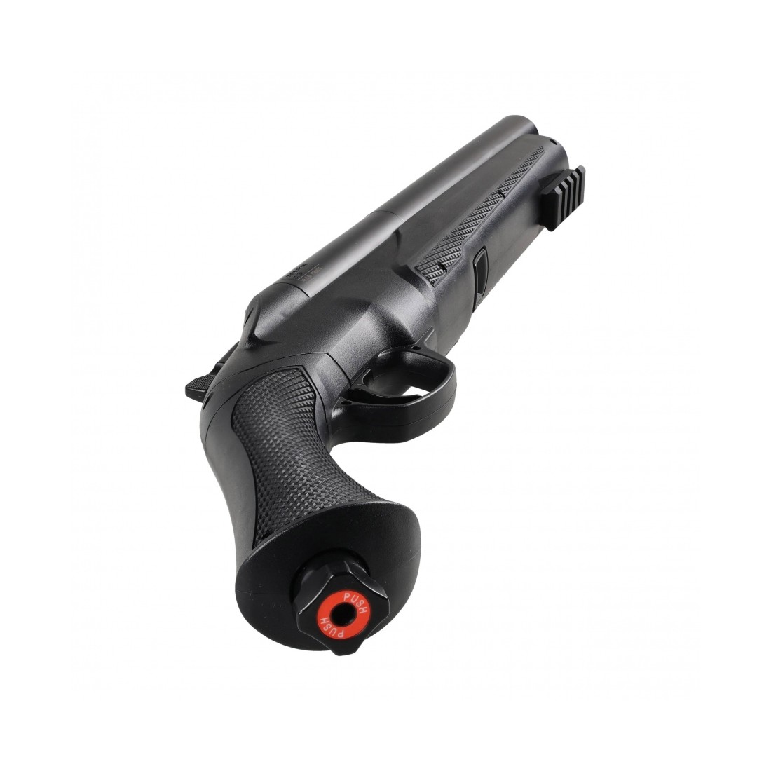 Strzelba zasilana jest 12 g kapsułą CO2 montowaną w profilowanej rękojeści. W odróżnieniu jednak od standardowych replik i pistoletów pneumatycznych na CO2, w tym modelu kapsułę z dwutlenkiem węgla możemy przenosić bez ograniczeń czasowych! Wszystko za sprawą przemyślanego mechanizmu, który pozwala błyskawicznie przebić kapsułę dopiero w momencie, w którym chcemy skorzystać z miotacza. W tym celu wystarczy jedynie lekko uderzyć w wystające z rękojeści pokrętło, rozprężenie gazu następuje samoistnie, a strzelba jest w ułamku sekundy gotowa do działania. Takie rozwiązanie powoduje, że nie musimy martwić się o uszkodzenie zaworów i gwarantuje nam, że w sytuacji zagrożenia będziemy korzystać z energii pełnej kapsuły.