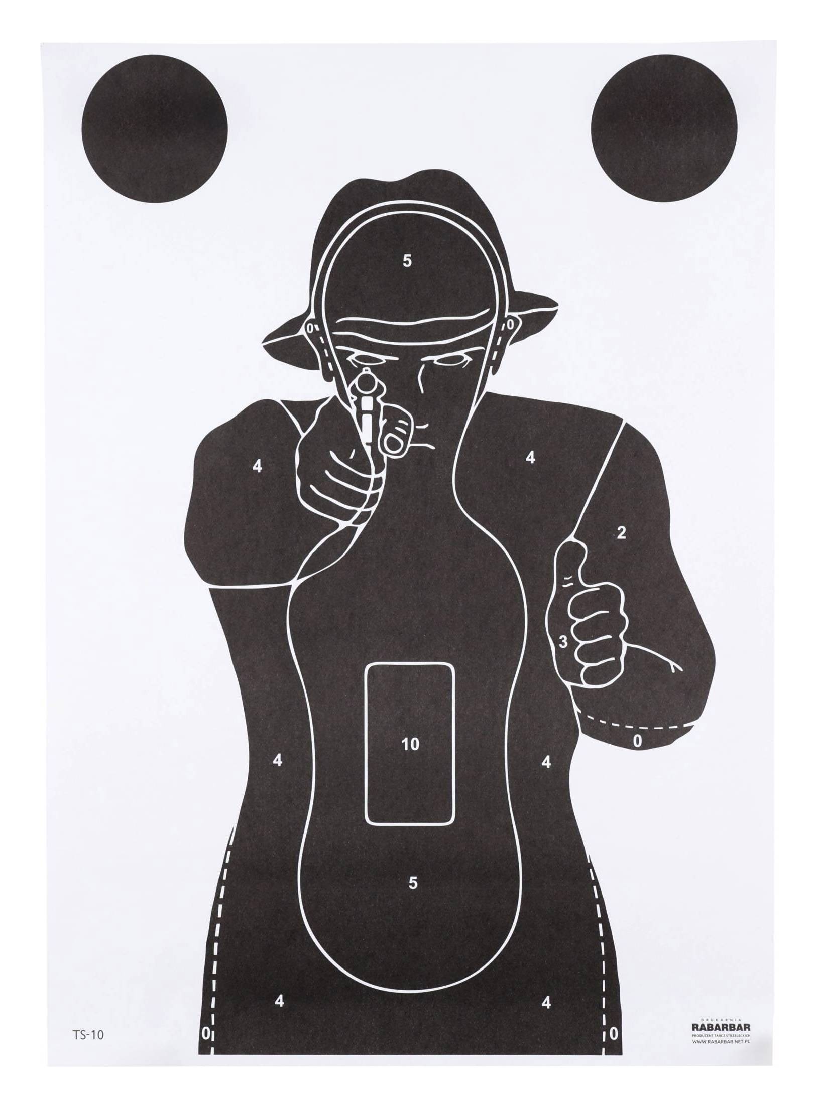 Tarcze strzeleckie Sylwetkowe TS-10 (czyli popularny Francuz), które mają pełną zgodność z normami UE i oznaczeniem CE. Tarcze wykonane są na papierze offsetowym i przedstawiają czarną sylwetkę na białym tle. W górnej części dodatkowo naniesiono dwa czarne pola. Tarcze nadają się do treningu służb mundurowych oraz również w strzelectwie rekreacyjnym. Zestaw zawiera 50 egzemplarzy tarcz.