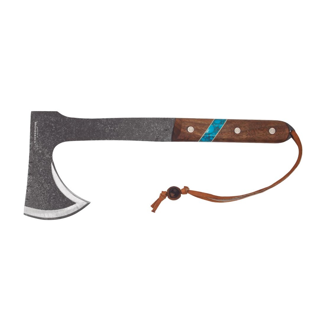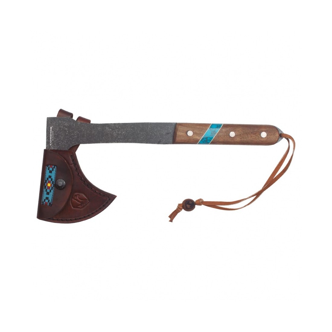Rękojeść z drewna orzechowego wyróżnia się osadzonym kamieniem o turkusowym wzorze, będącym symbolicznym odniesieniem do tradycyjnej biżuterii rdzennych Amerykanów. W tylnej części chwytu umieszczono otwór z rzemieniem zabezpieczającym, który zapobiega przypadkowemu wyślizgnięciu się tomahawka podczas użytkowania. Całość dopełnia ręcznie wykonana skórzana pochewka, umożliwiająca bezpieczne przenoszenie i przechowywanie narzędzia.