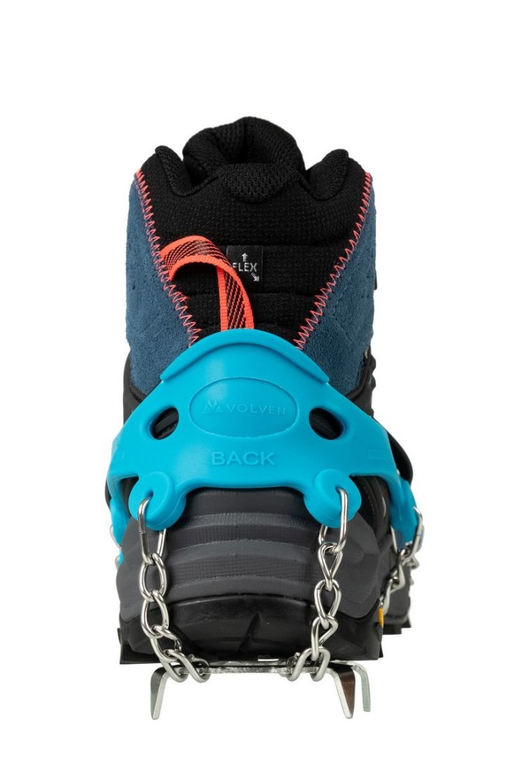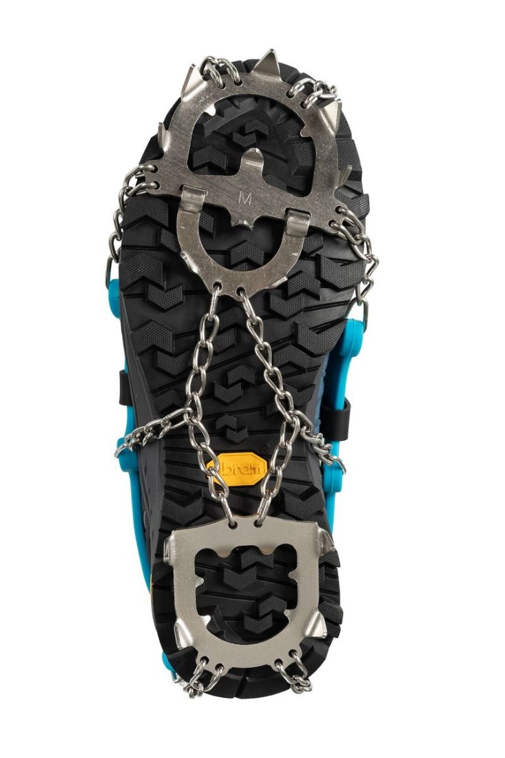 Przednia i tylna płytka stabilizują podeszwę, redukując tarcie, a zawias w przedniej płytce pozwala na naturalny ruch stopy. Raczki pasują do większości obuwia turystycznego, nawet z miękką podeszwą.