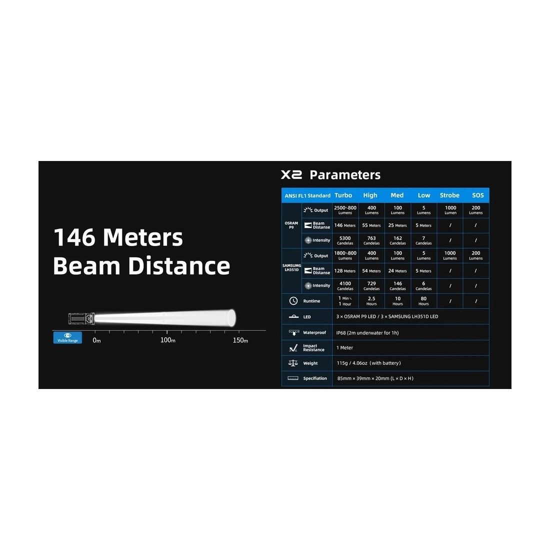 Latarka Wuben X2 to połączenie niewielkich rozmiarów i imponującej wydajności. Trzy diody OSRAM P9 LED generują maksymalnie 2500 lumenów, zapewniając jasność porównywalną z pełnowymiarowymi latarkami taktycznymi. Dzięki solidnej konstrukcji z aluminium i klasie szczelności IP68, Wuben X2 sprawdza się zarówno w codziennym użytkowaniu, jak i podczas wypraw terenowych, biwaków czy w pracy służb ratowniczych.