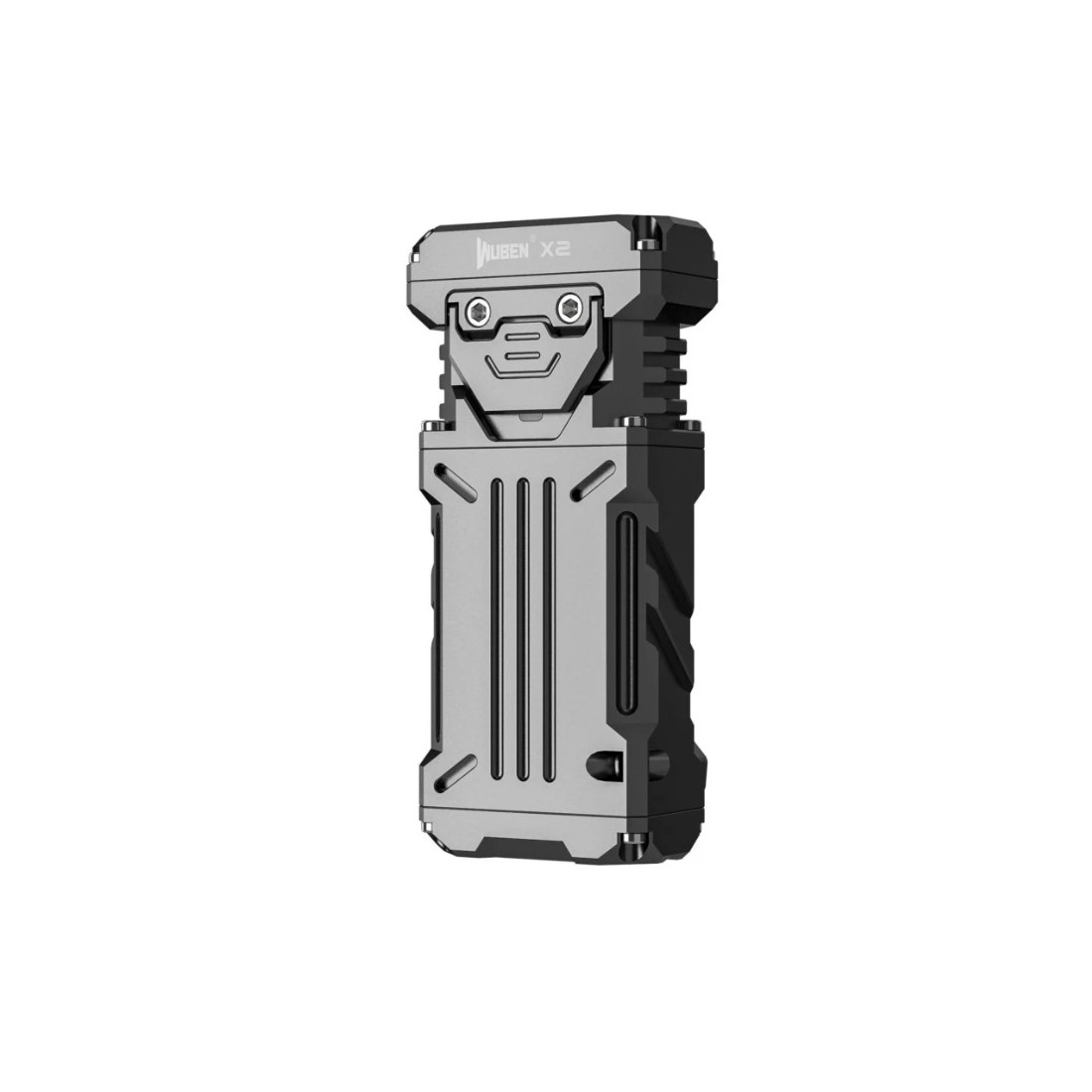Model X2 został zaprojektowany jako mocna latarka EDC-taktyczna łącząca wymagania outdoorowe i codzienne. Maksymalna moc 2500 lumenów umożliwia efektywne oświetlenie nawet trudnych terenów czy przestrzeni. Obudowa wykonana z tytanu/połączenia aluminium jest wytrzymała i elegancka. Dzięki magnetycznej podstawie latarkę można umieścić na metalowej powierzchni i używać do pracy bez użycia rąk. Ładowanie bezprzewodowe ułatwia użytkowanie: wystarczy umieścić latarkę na stacji, aby ją naładować–bez konieczności wymiany baterii.