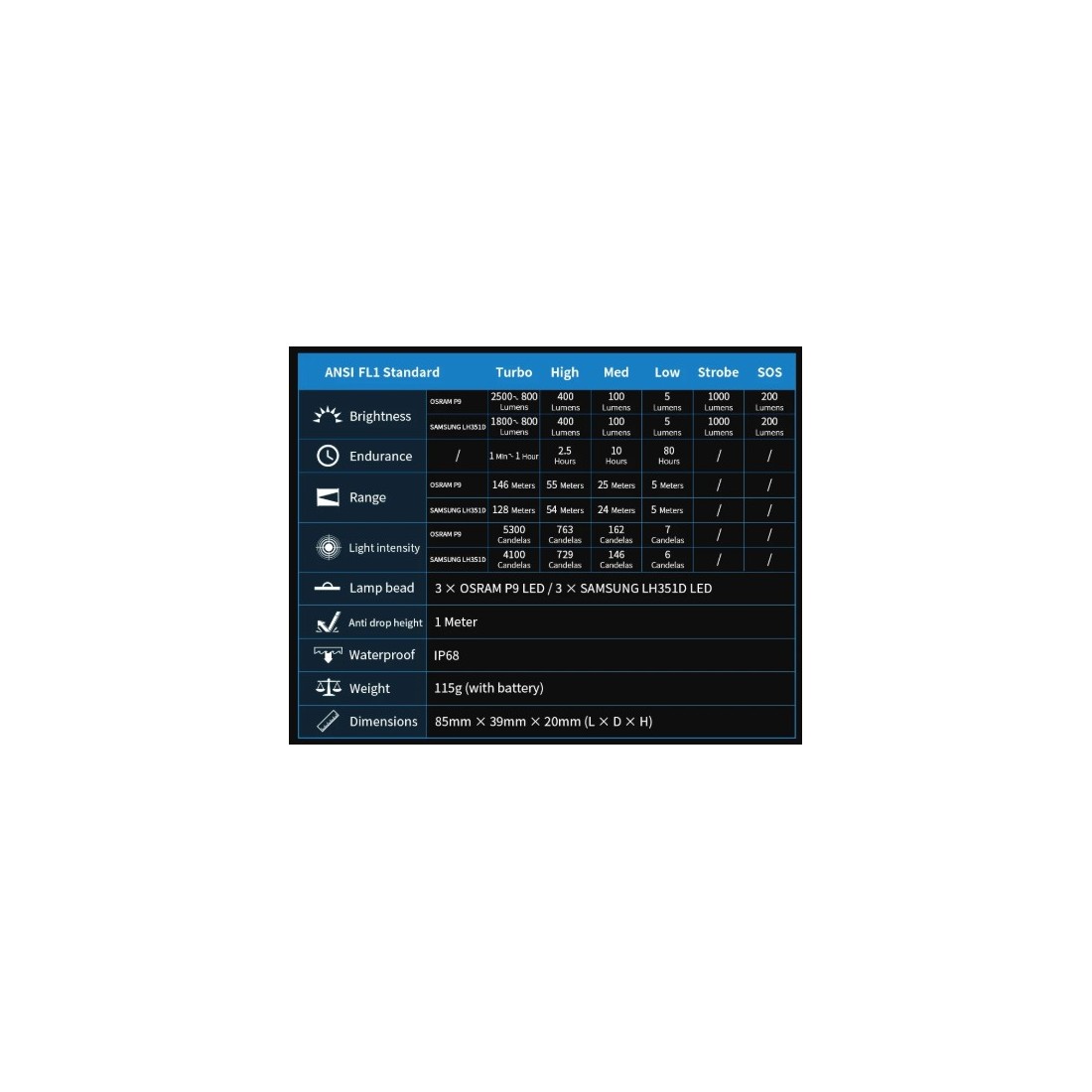 Latarka posiada 6 trybów pracy – od ekonomicznych po tryb Turbo, Strobe i SOS — co czyni ją odpowiednią zarówno do codziennego noszenia, jak i sytuacji awaryjnych lub terenowych. Dołączony czerwony filtr dyfuzyjny umożliwia dyskretną pracę nocą i ochronę nocnego widzenia. Certyfikat IP68 potwierdza odporność na wodę i pył, co czyni ją latarką trwałą i niezawodną przy zróżnicowanych warunkach.