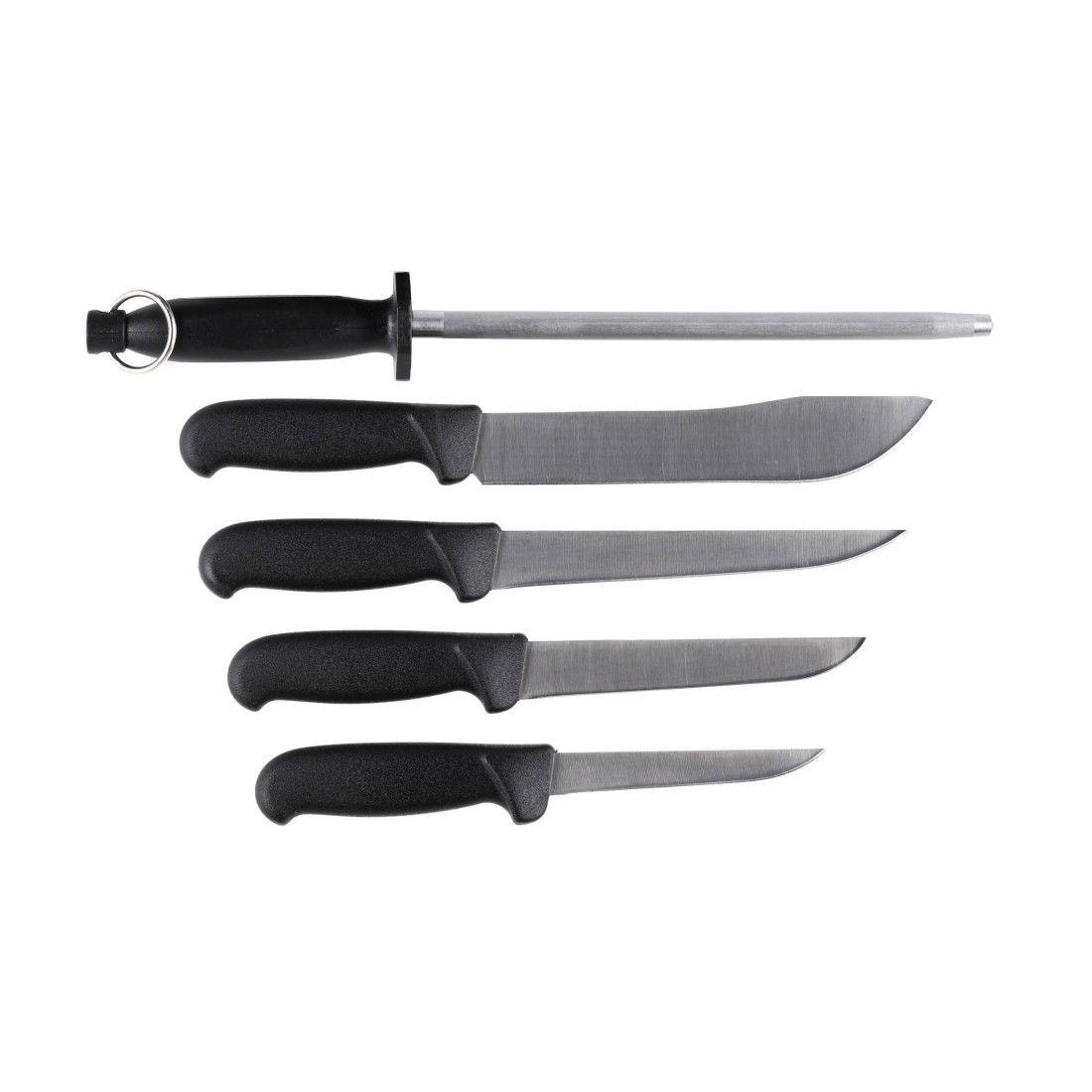 Komplet 4 noży rzeźniczych Mikov 300.005/D zawiera 4 profesjonalne noże masarskie oraz pręt ostrzący, czyli to wszystko, czego nam potrzeba do domowej obróbki mięsa.