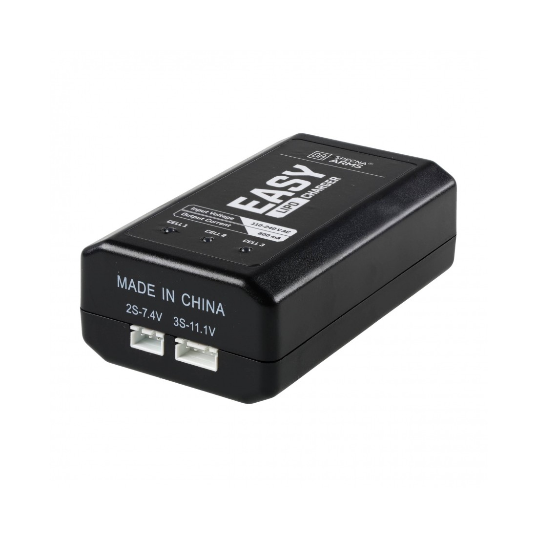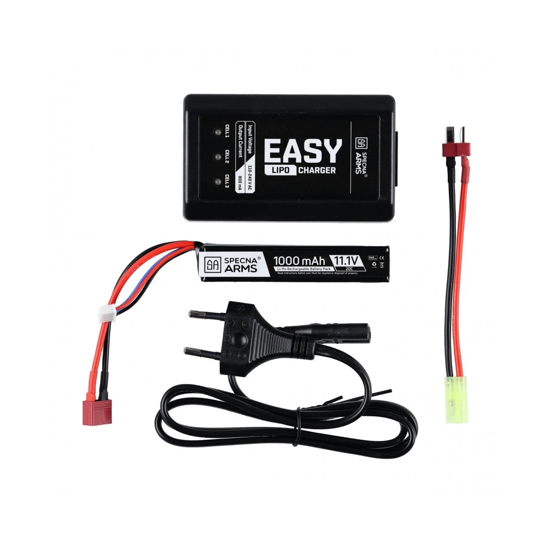 Zestaw Specna Arms EASY zawierający w sobie podstawową ładowarkę do baterii Li-Po, z funkcją ładowania baterii złożonych z dwóch ogniw (7,5V) oraz trzech ogniw (11,1V). Dodatkowo w zestawie otrzymujesz akumulator Li-Po 11,1 V o pojemności 1000 mAh, wyposażonego we wtyk Deans/T-Connect.