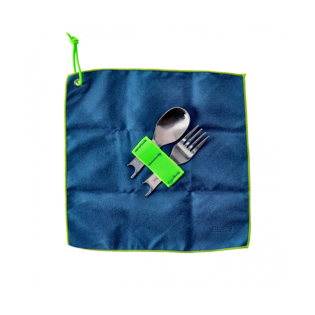 Zestaw zawiera dwie nakładki – łyżkę i widelec. Oba elementy są łatwo demontowalne, solidne i higieniczne. Wykonane je ze stali nierdzewnej. W opakowaniu umieszczono również pokrowiec z mikrofibry, który można wykorzystać do przechowywania i czyszczenia sztućców.